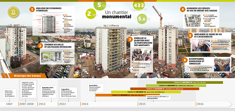 Mille et une a conçu pour Val Touraine Habitat la Lettre info travaux, qui annonce l'avancement des travaux de rénovation des cinq tours à Saint-Pierre-des-Corps. Dans la foulée, a été conçue une plaquette trois volets présentant l'ensemble de ce programme de grande envergure. Ces documents sont à destination des habitants du quartier.